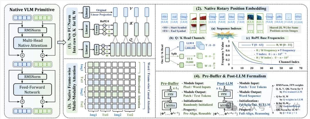 NEO的Native-RoPE创新性地为时间(T)、高度(H)、宽度(W)三个维度分配了不同的频率:视觉维度(H, W)使用高频,以精准刻画局部细节和空间结构;文本维度(T)兼顾高频和低频,同时处理好局部性和长距离依赖。
