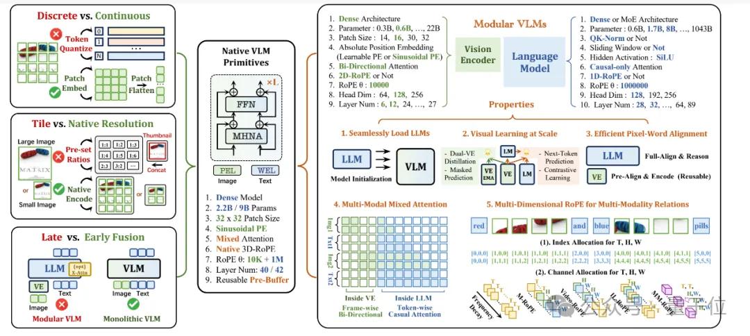 这种策略便巧妙地解决了原生架构训练中如何在不损害语言能力的前提下学习视觉的难题。