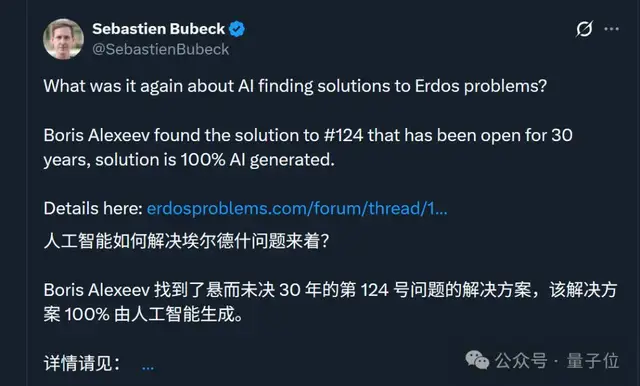 微软前AI副总裁、目前在OpenAI研究AGI的Sebastien Bubeck表示“该解决方案100%由AI生成,总计耗时6小时”。