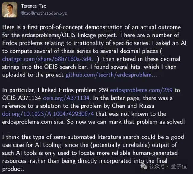 他借助GPT-5对相关数列进行高精度计算,随后将得到的结果输入OEIS(一个收录全球数列的数据库)进行检索对照,进而发现部分Erdős问题其实早已在既有研究中被解决——只是长期没人注意到,未把结果与问题库对应起来。