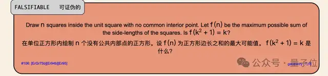 根据Erdős#106,他将f(n)引入该问题,设定其为最小数,使得把n个正方形按平行坐标轴打包进一个大正方形时,满足:
