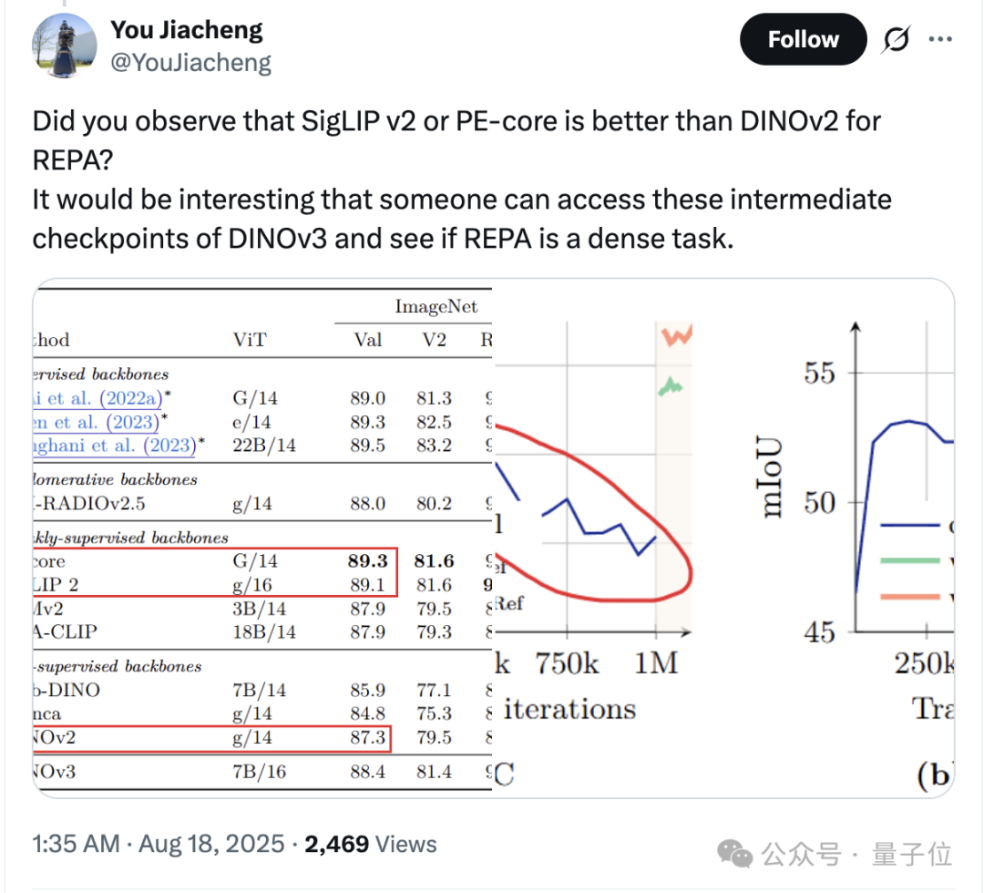 对于谢赛宁的反驳,网友举出了SigLIPv2和PE-core优于DINOv2 for REPA的例子。