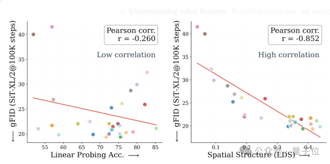在具体的研究方法上,研究通过一次大规模的定量相关性分析对这一观察进行了细化验证:分析覆盖了27 种不同的视觉编码器(包括 DINOv2、v3、Perceptual Encoders、WebSSL、SigLIP 等)以及 3种模型规模(B、L、XL)。