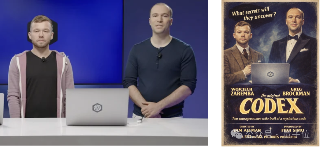 根据这两位男士的图片,制作一张名为《Codex》的好莱坞黄金时代电影海报。演员姓名改为Wojciech Zaremba(左)和Greg Brockman(右),由奥特曼执导,菲吉·西莫制片,AGI影业出品。