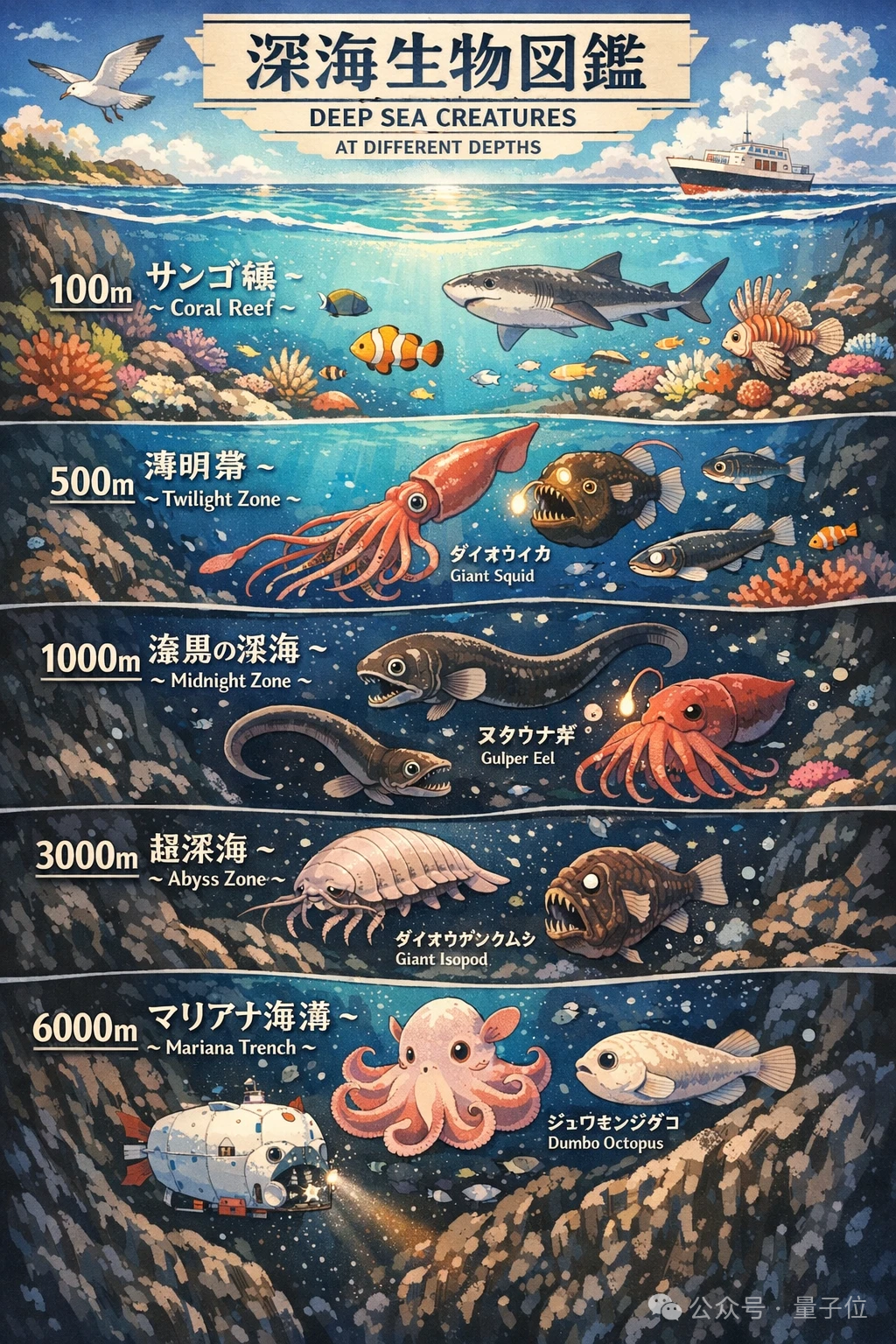 创作一张深海生物在不同深度的海报,采用垂直海洋剖面图,风格为精美细致的日式动漫风格。