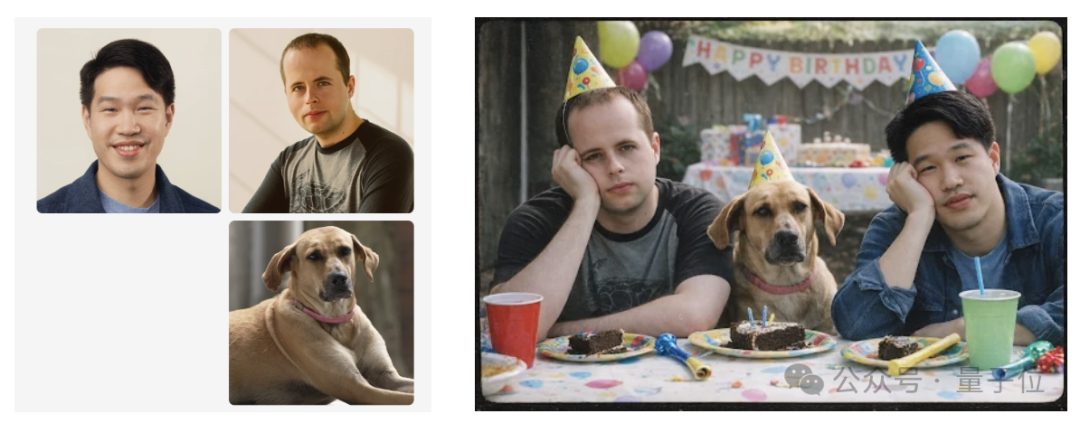 例如:生成一张2000年代胶片相机风格的照片,画面中两名男子和一条狗出现在孩子的生日派对上,神情略显无聊。