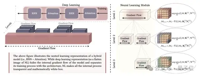 这个发现,成为了撬动整个新范式的支点。它意味着,从最底层的优化器,到中层的注意力机制,再到整个神经网络,都可以被统一地重新审视——它们不再是功能各异被拼凑起来的零件,而是在不同速度、不同抽象层级上,嵌套运行的“学习-记忆”模块