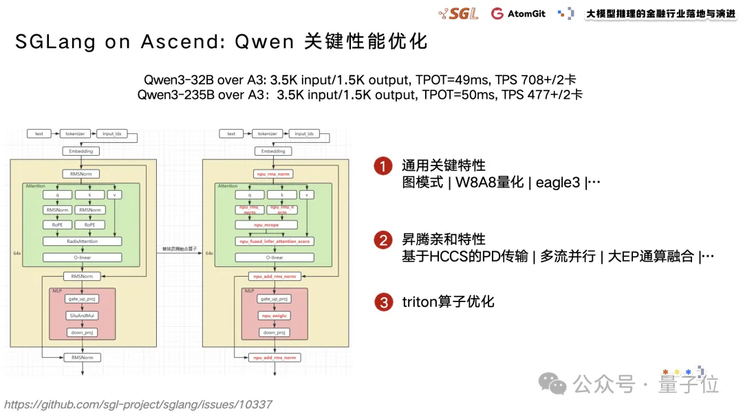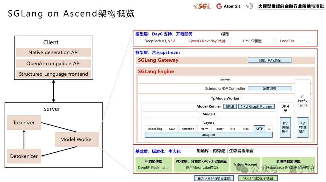 在上述共性问题之下,活动中也展示了SGLang在昇腾平台上的最新进展,覆盖模型适配、性能优化及系统加速能力模块化沉淀。