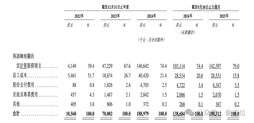 直观上看是训练成本的金额在持续提升,2022年、2023年、2024年及2025年前九个月分别为415万美元、4723万美元、1.4亿美元和1.42亿美元。