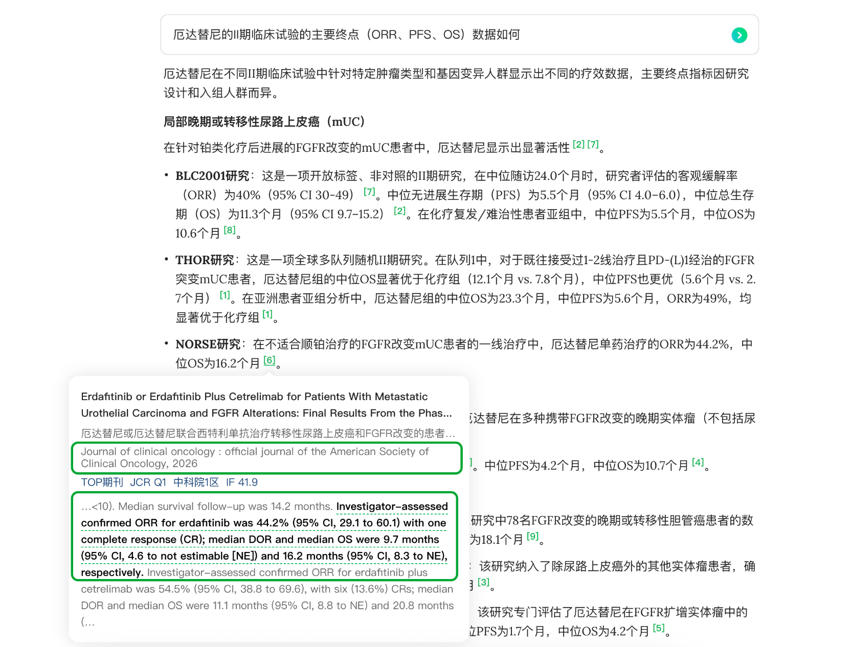 例如,当用户在氢离子搜索“厄达替尼的II期临床试验的主要终点(ORR、PFS、OS)数据如何”时,系统不仅给出结构化的医学结论与分析,还会在每项结论旁标注引用标签,点击标签即可查看该结论引用的原始文献及支撑的具体语句。用户可以从结论到证据的无缝追溯,确保每一处引用均可验、可信。