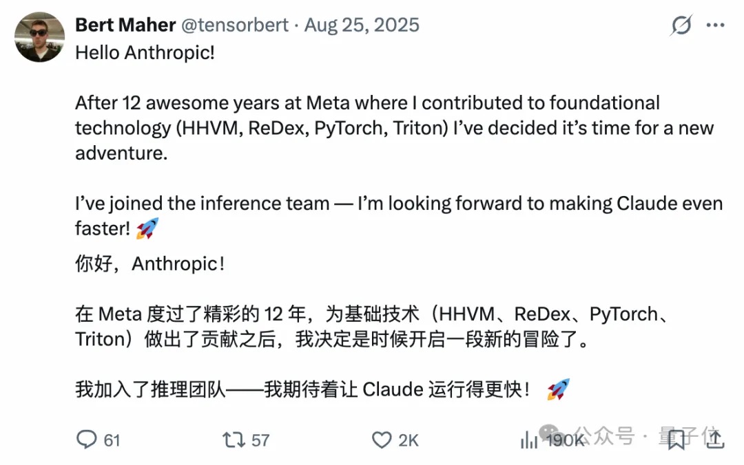 另外还有一位在Meta工作了12年的资深工程师Bert Maher,他曾参与开发 PyTorch(全球广泛使用的 AI 训练工具)和 Triton(优化 AI 模型运行的编程语言与编译器)。2025年8月官宣加入Anthropic,并表示自己将致力于让 Claude “跑得更快”。
