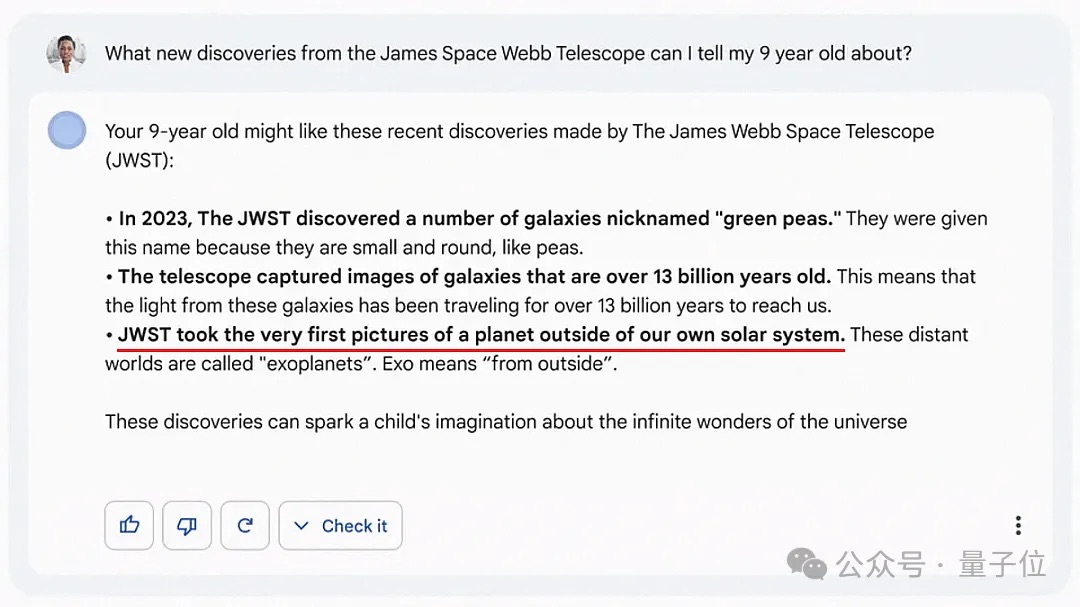 2023年2月8日,谷歌举行 Bard 人工智能演示直播。在演示视频中,Bard 回答詹姆斯・韦伯太空望远镜时出现事实性错误,导致 Alphabet 股价下跌近 9%, 市值蒸发了约 1000 亿美元。